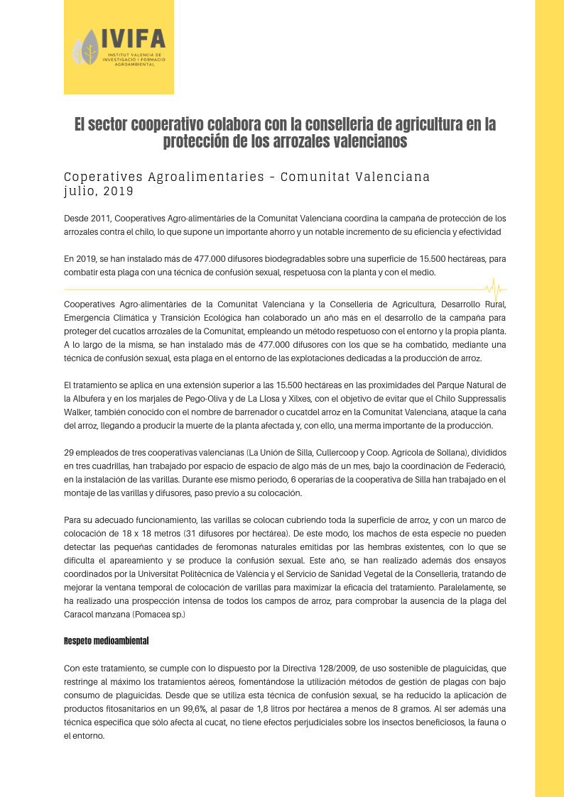 Destacados, IVIFA, Ultimas Noticias El sector cooperativo colabora con la conselleria de agricultura en la protección de los arrozales valencianos Publicado por fundacionivifa el 25 julio, 2019 COOPERATIVES AGRO-ALIMENTÀRIES DE LA COMUNITAT VALENCIANAprensa@agro-alimentariescv.coop | 606 611 780 Compártelo a tus amigos: Haz clic para compartir en Facebook (Se abre en una ventana nueva) Facebook Haz clic para compartir en X (Se abre en una ventana nueva) X Haz clic para compartir en LinkedIn (Se abre en una ventana nueva) LinkedIn Haz clic para enviar un enlace por correo electrónico a un amigo (Se abre en una ventana nueva) Correo electrónico Haz clic para imprimir (Se abre en una ventana nueva) Imprimir Me gusta Cargando... Relacionado Publicado por fundacionivifa Ver todas las entradas de fundacionivifa